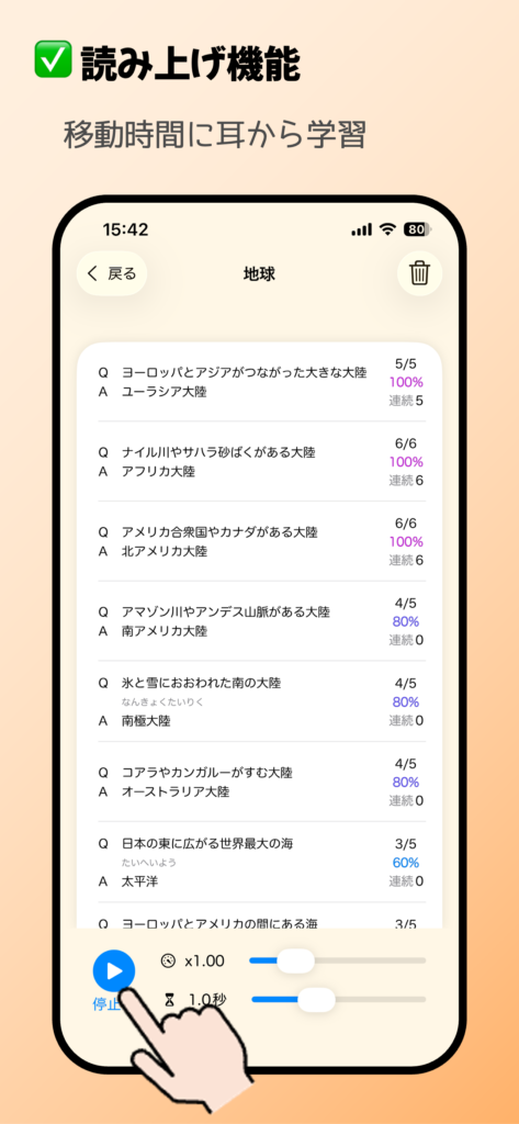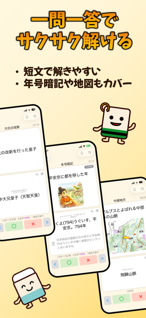社会・理科・国語の一問一答問題を収録し、スキマ時間にサクッと学べる学習アプリです