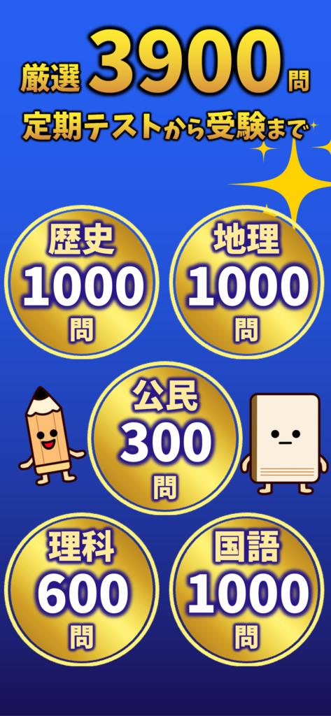 社会:歴史 1,000問(年号暗記含む)、地理 1,000問、公民 300問