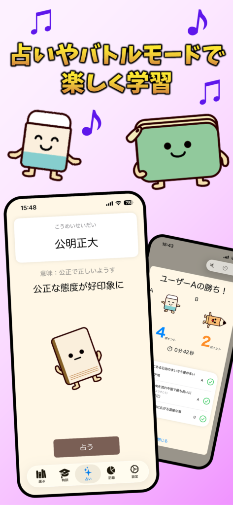四字熟語やことわざを使った占いで、今日の運勢を楽しみながら学べる占い機能