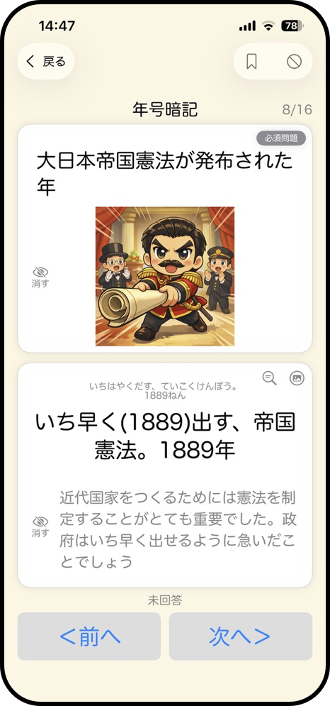 歴史は年号を暗記すると出来事の流れがスムーズに理解できるようになります。学習アプリ「暗記学園」では語呂合わせで覚える年号をサポートしていましたが、今回、新たに語呂合わせの意味について想像しやすいようにかわいらしいイラストと解説を追加しました。