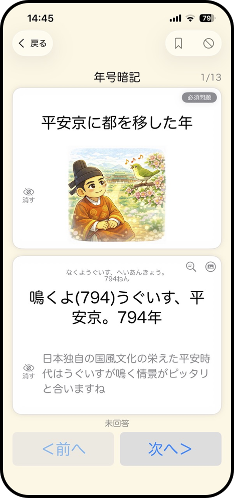 次に、文頭の「鳴くよ」がそのまま794を想起できるので、記憶が定着してくると即座に回答できる点も素晴らしいと思います。覚える文の途中に年号が出てきたり、年号の語句が離れてしまっていると、どこが年号だったっけ?という状態になりがちです。